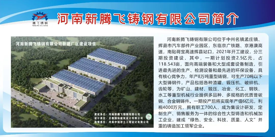 因鑄件產(chǎn)品供不應求,為了更好服務(wù)客戶(hù),公司投資2.5億元資金,新建“河南新騰飛鑄鋼有限公司”,占地面積120畝,打造年產(chǎn)8萬(wàn)噸高 端裝備制造大型優(yōu) 質(zhì)鑄鋼件生產(chǎn)基地。
